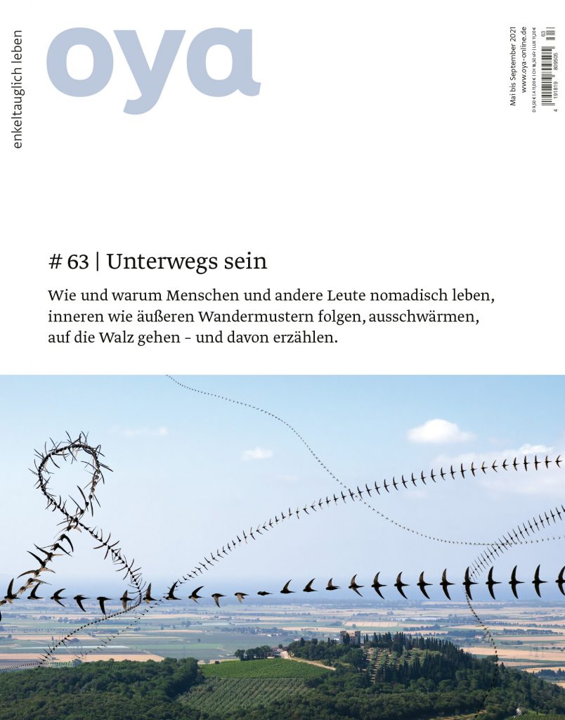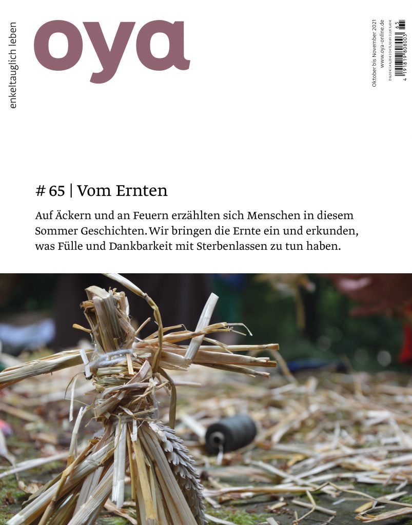 Oya ist eine kollektive Geschichtenerzählerin. In unruhigen Zeiten sammelt sie in ihren Beutel Erzählungen von gemeinschaffenden, widerständigen, subsistenten und pflegnutzenden Lebensweisen auf der einen Erde. Sie fragt: Wie können Menschen hier und heute das Naheliegende und Notwendige tun, eingebettet in die Tiefe der Zeit, in die Schönheit des Augenblicks und in die mehr-als-menschliche Welt? Sie verwebt lebensdienliche Orte, Projekte und Praktiken. Oya erscheint in wechselnden Formen: von gedruckten Commoniebriefen und einem durchs Jahr begleitenden Almanach über Hörstücke bis hin zu persönlichen Zusammenkünften bei Wirkwochen, Erzählsalons oder Almanachfesten. mehr