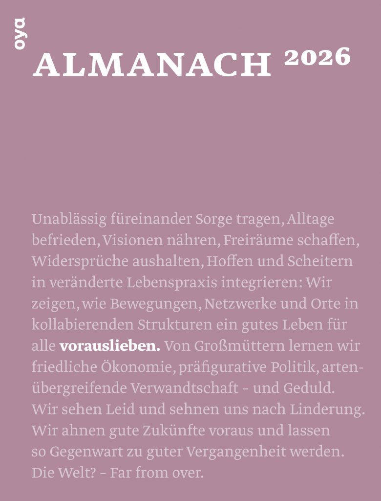 Gute Zukünfte vorauslieben Der dritte Oya-Almanach zeigt in Geschichten, Essays, Interviews, Gedichten und Bildkunst, wie Bewegungen, Netzwerke und Orte in kollabierenden Strukturen Visionen nähren, Fürsorge leben und für ein gutes Leben aller wirken. Das Jahrbuch erscheint am 17. Januar 2026.
